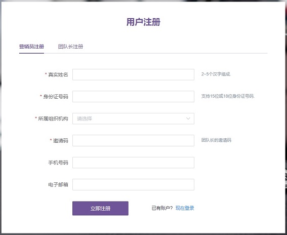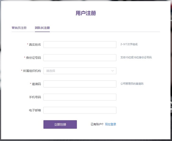 团队加盟时,团队负责人注册为“团队长”,团队成员注册为“营销员”,由团队长提供邀请码组建团队。